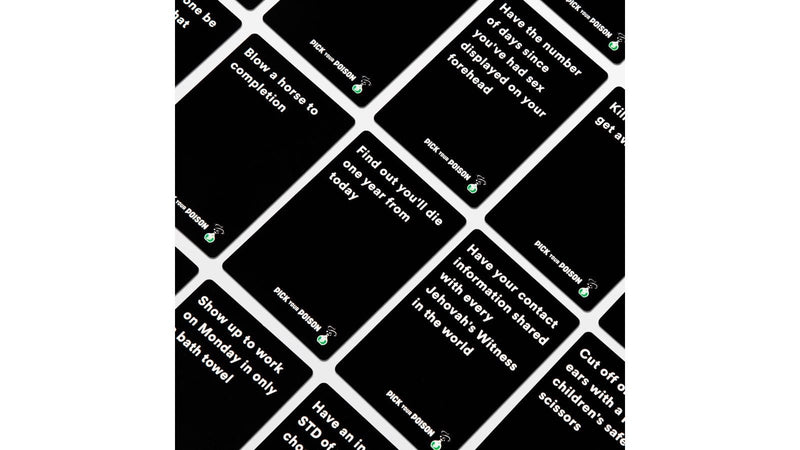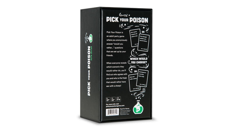 Pick Your Poison is an adult card game of unfathomable “Would you rather…?” scenarios.